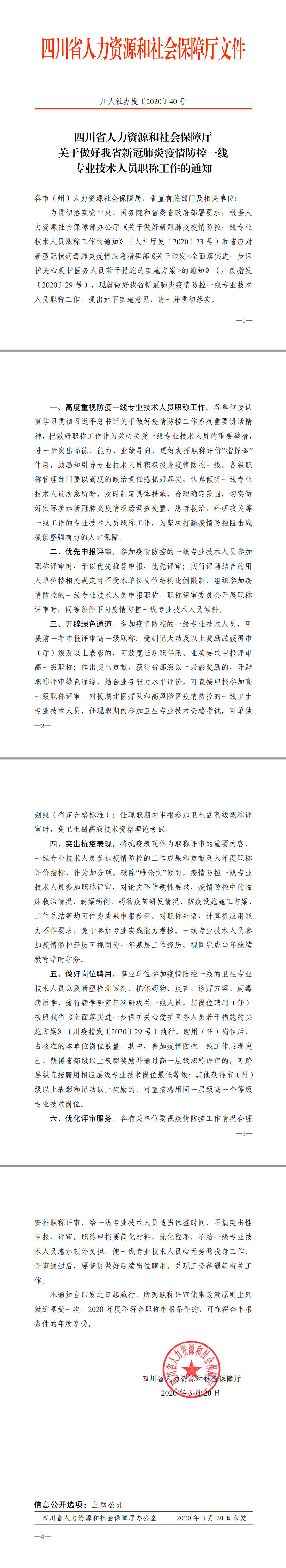 川人社办发〔2020〕40号关于做好我省新冠肺炎疫情防控一线专业技术人员职称工作的通知