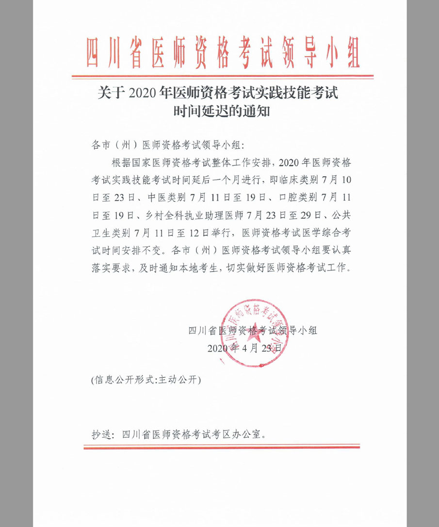 关于2020年医师资格考试实践技能考试时间延迟的通知