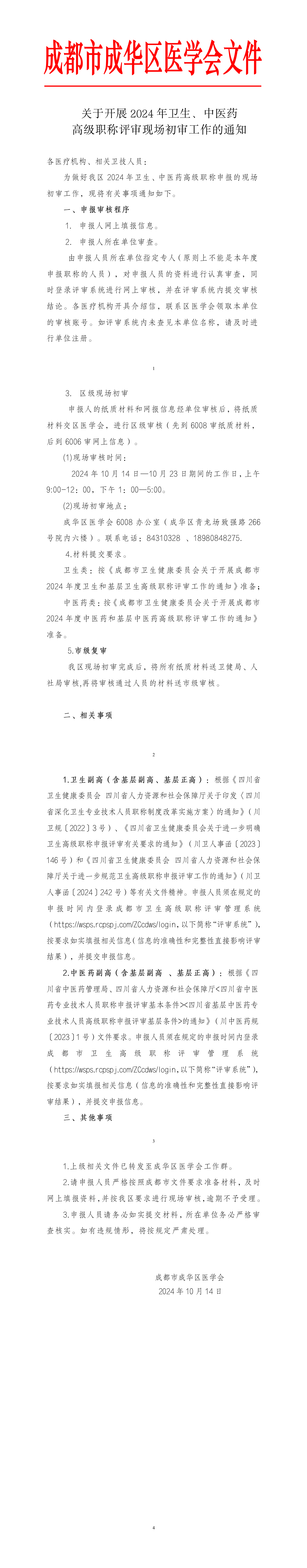 关于开展2024年卫生、中医药 高级职称评审现场初审工作的通知